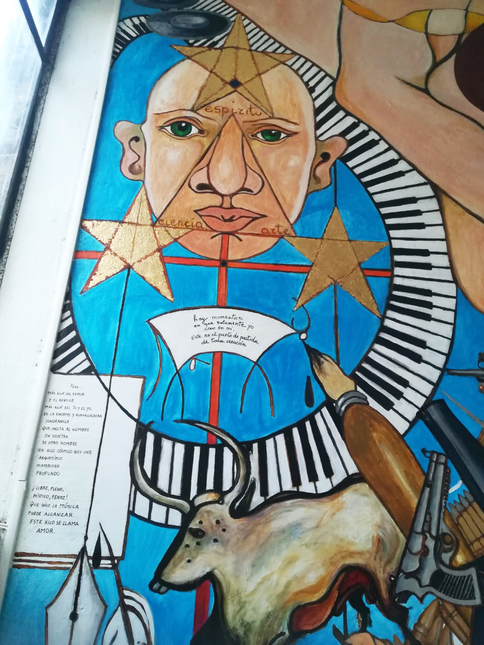 ¿Por qué a veces me firmo “Sonne”? Porque es mi tribu. Pertenezco a la tribu del Sol desde el nacimiento. Por qué en alemán? Porque así me llegó, oyendo la canción “Seemann” del grupo Rammstein, mientras ojeaba unos libros en una librería Gandhi de México. Me llegó como un canto antiguo del cual no sabía individuar el idioma. Nunca lo había escuchado; solo sentía que provenía de la noche de los tiempos y que me pertenecía, o que yo pertenecía a ese canto. Probé una gran emoción. Al enterarme de quien se trataba y de la historia de este grupo más allá de las apariencias y de su “industrialización”, sentí la profundidad de un pueblo que se rescata a si mismo. Al igual que aquellas manos juntas hechas de fuego en el auditorio londinense del joven grupo de Pink Floyd, cuando estrenaron “The dark side of the moon”, en marzo de 1973. Esas mismas manos son las que rezan al centro de la puerta del mural Fe en la Tierra para que la humanidad, entre los miles de conflictos de una sociedad siempre cambiante, encuentre equilibrio, armonía, paz, amor, alegría, un sentido a la vida y si quiere pelear, pues, que lo haga en pelea limpia, midiendo fuerzas, ya que este es el instinto del hombre.